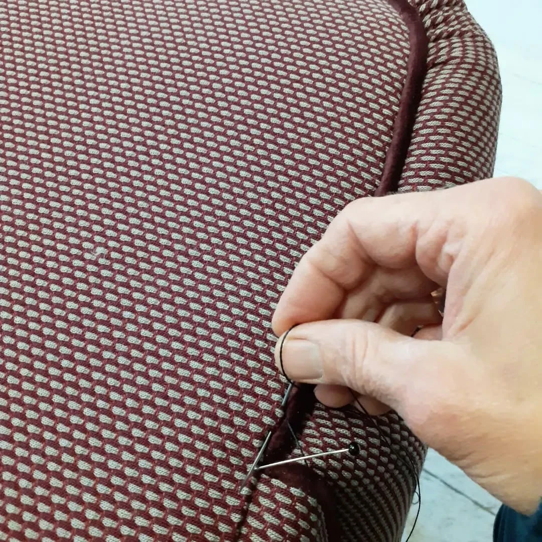 Der neue Bezugstoff wurde nach dem alten Muster zugeschnitten. Der schrittweise Bezug erforderte besondere Aufmerksamkeit bei den Details an Kanten und Rückenpolster, um die charakteristische Formgebung wieder herzustellen