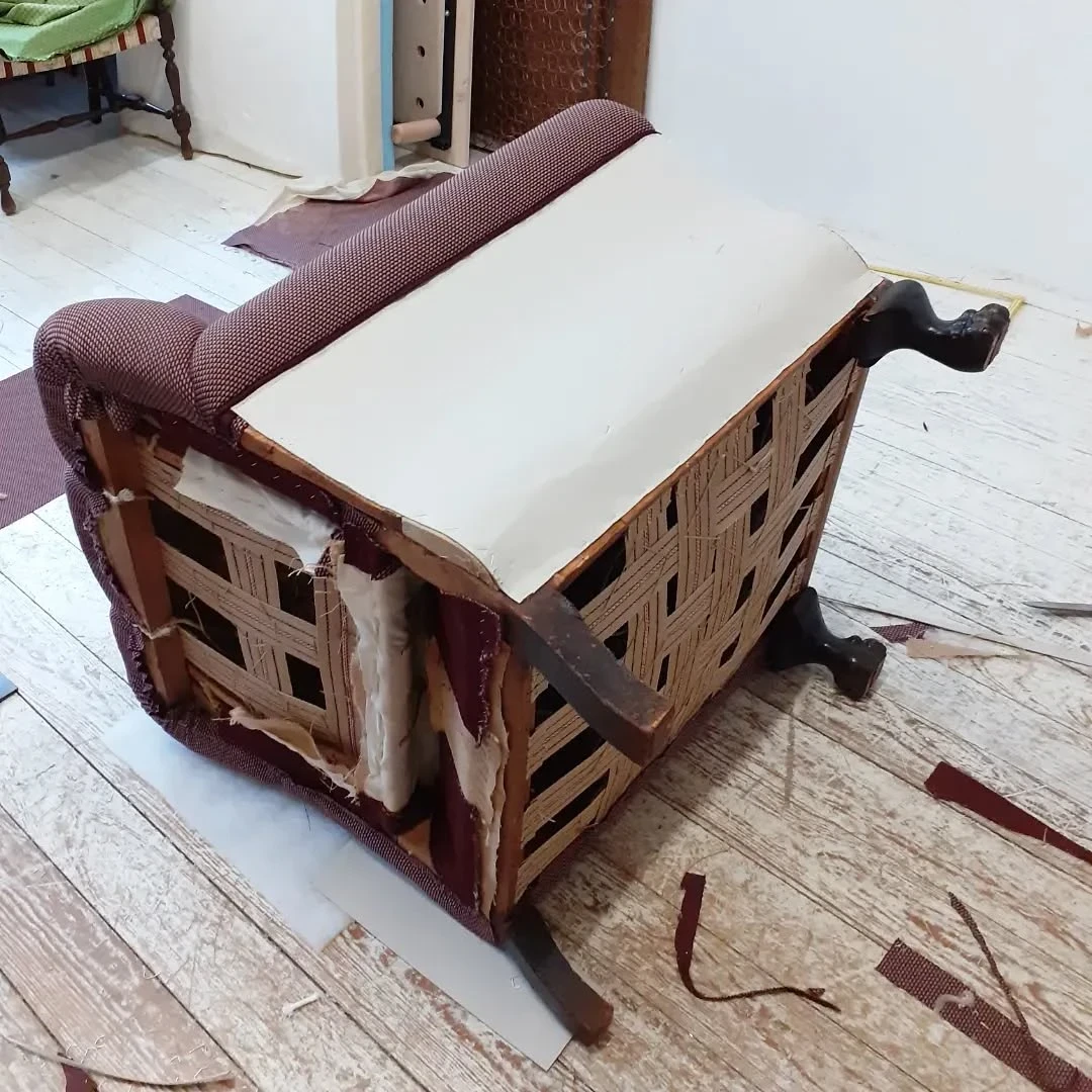 Der Sessel wurde vollständig entkernt. Die Löwentatzenfüße wurden aufgearbeitet und der Federkern stabilisiert, um eine solide Basis für die Neupolsterung zu schaffen.