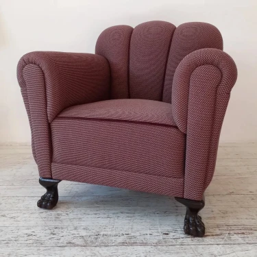Der Armsessel mit charakteristischen Löwentatzenfüßen wurde einer vollständigen Restaurierung unterzogen. Für den neuen Bezug kam der Stoff "Drop" von Kvadrat zum Einsatz. Die Arbeit erfolgte in mehreren Phasen, wobei traditionelle Polstermaterialien mit modernen Vlies- und Schaumstoffmatten kombiniert wurden.