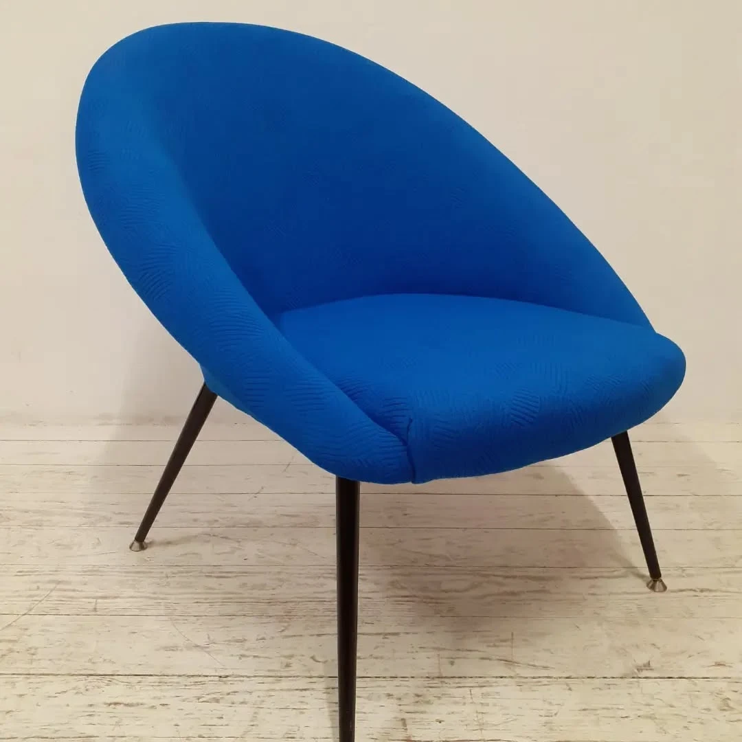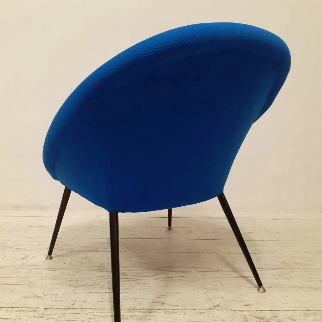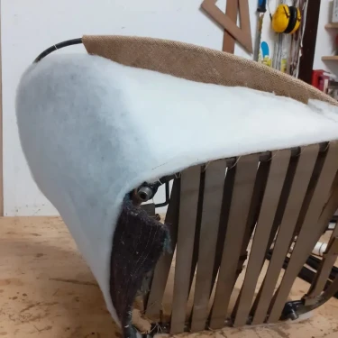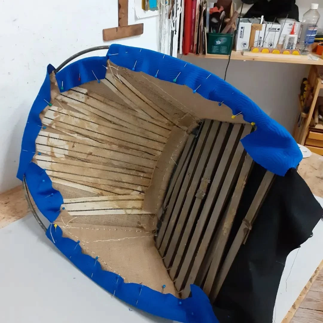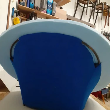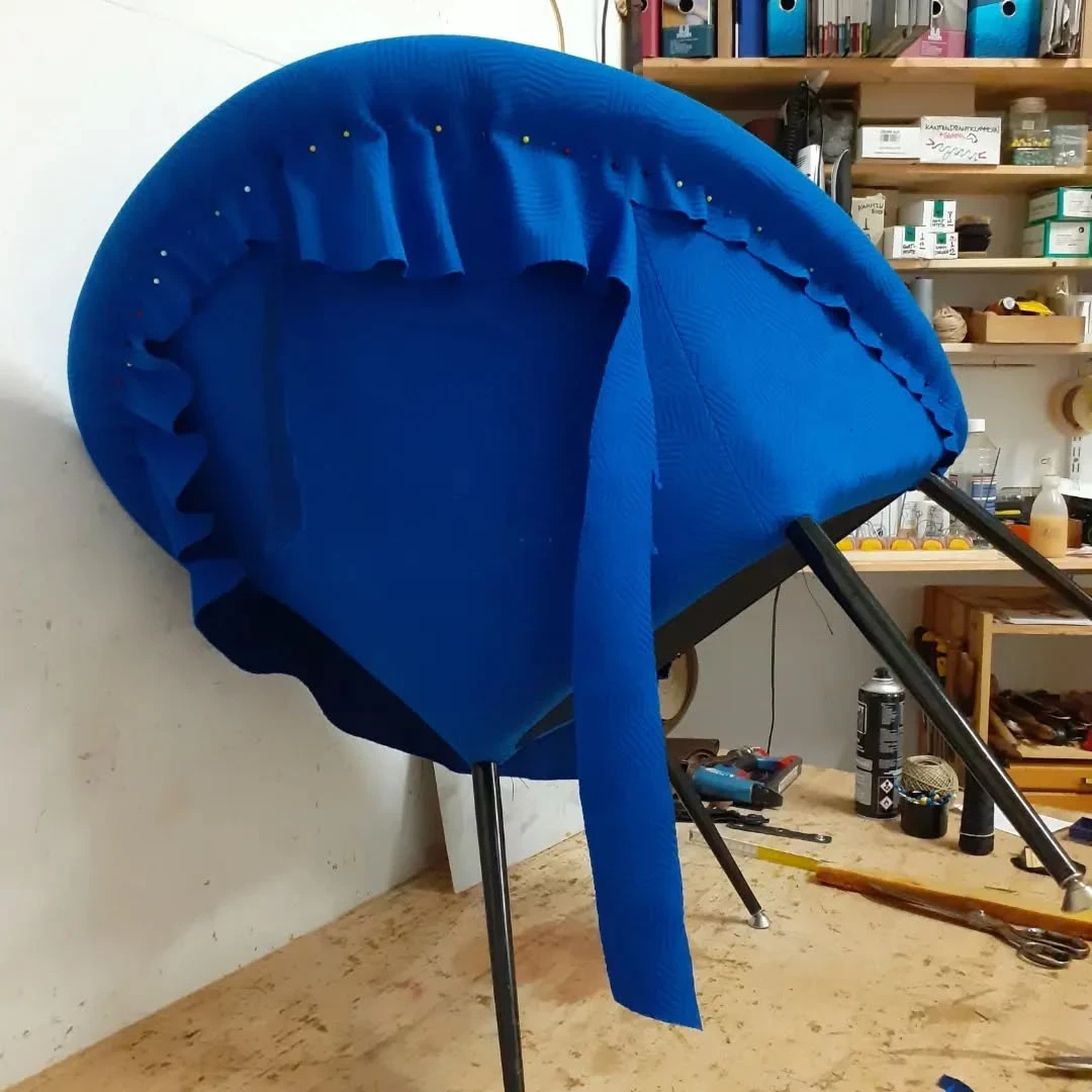 Für die Neuaufarbeitung wurde eine vollständige Polsterung aus Schaumstoff und Vlies aufgebaut. Der neue Bezug wurde mit dem Stoff "Razzle Dazzle" von Kvadrat ausgeführt, der die charakteristische Formensprache des Originals unterstreicht.