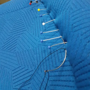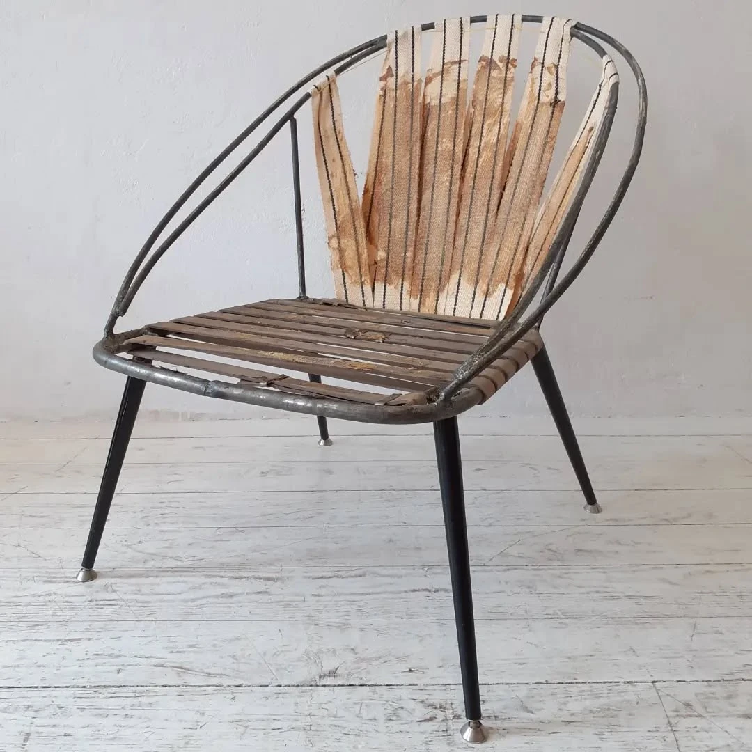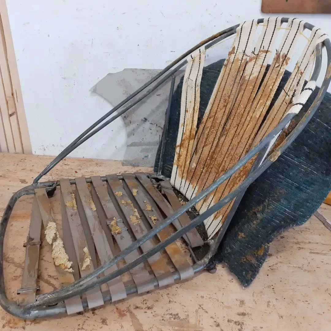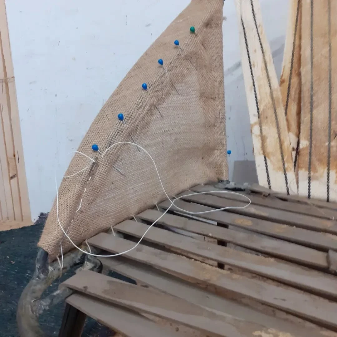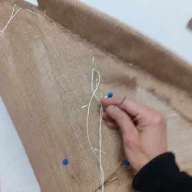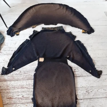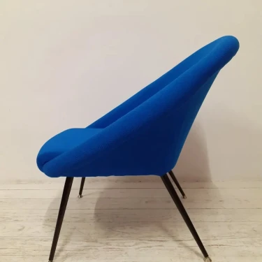 Für die Neuaufarbeitung wurde eine vollständige Polsterung aus Schaumstoff und Vlies aufgebaut. Der neue Bezug wurde mit dem Stoff "Razzle Dazzle" von Kvadrat ausgeführt, der die charakteristische Formensprache des Originals unterstreicht.