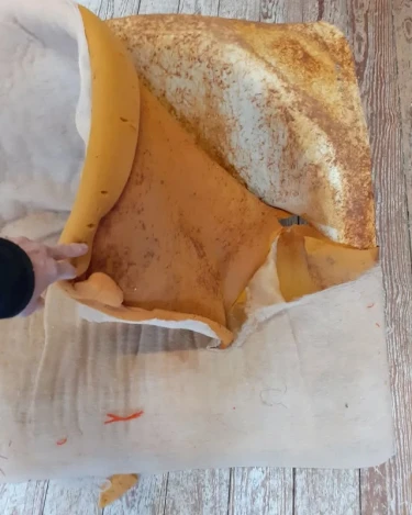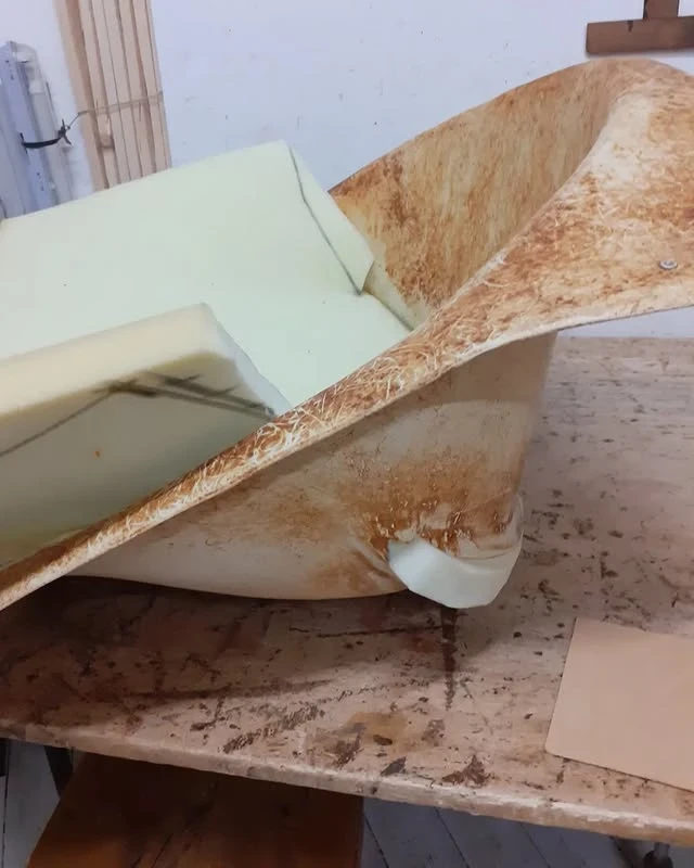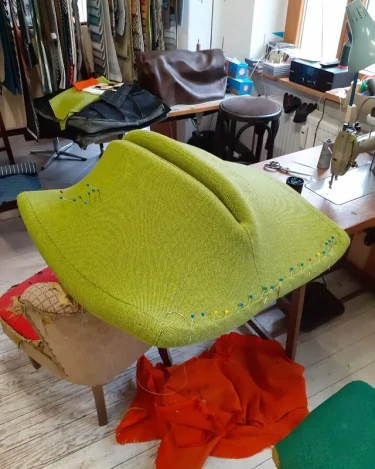 Der Neuaufbau der Polsterung erfolgte mit Schaumstoffmatten. Nach dem Aufbau wurde der Stuhl mit dem Stoff "Hallingdal" von Kvadrat bezogen und vernäht.