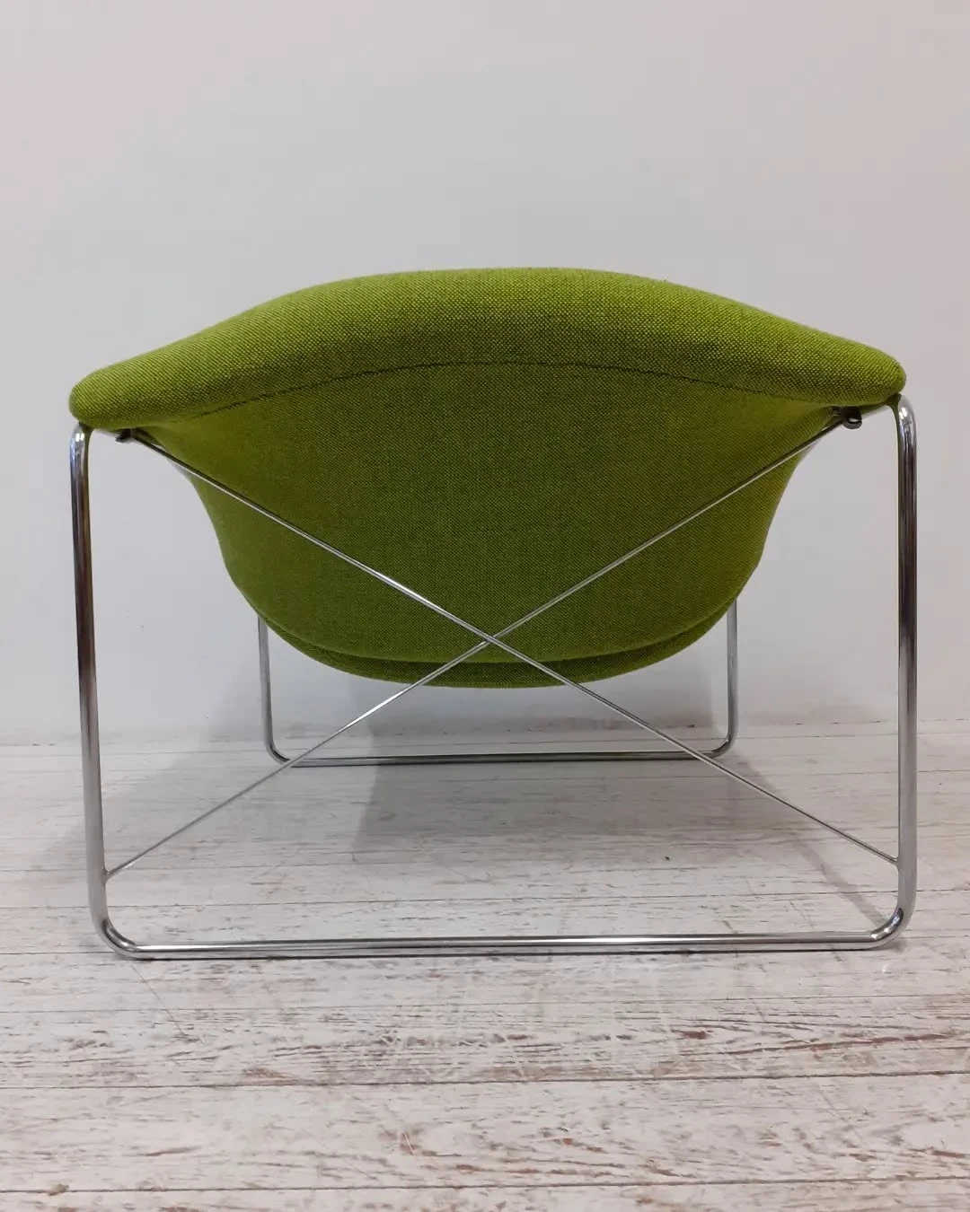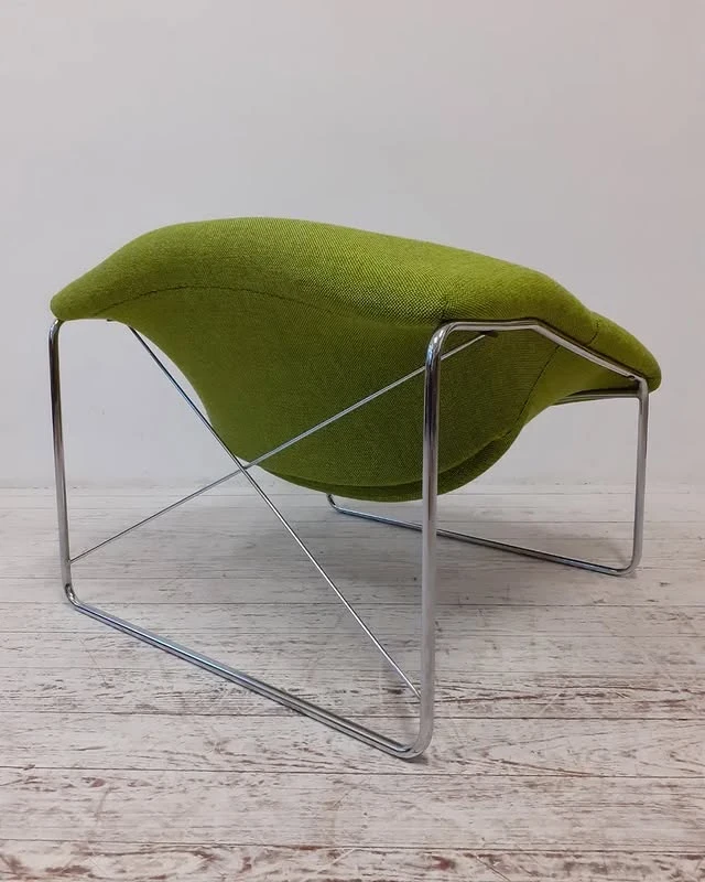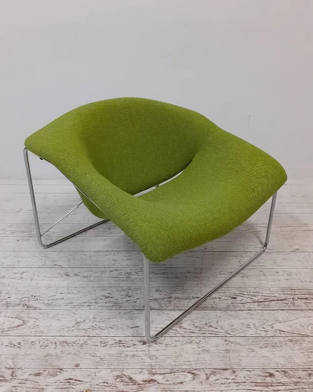Der "Cubique" Stuhl von Oliver Mourgue aus den 1960/70er Jahren repräsentiert die charakteristische Space-Age-Ästhetik dieser Ära. Das Möbelstück besteht aus einem verchromten Metallgerüst mit den Maßen 79 cm Breite, 70 cm Tiefe und 64 cm Höhe.