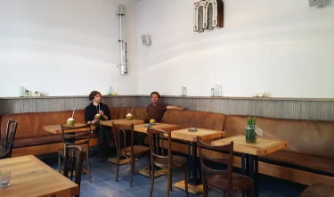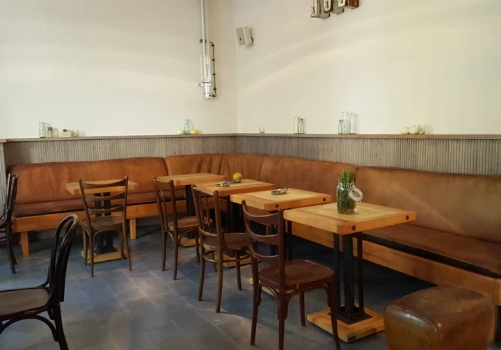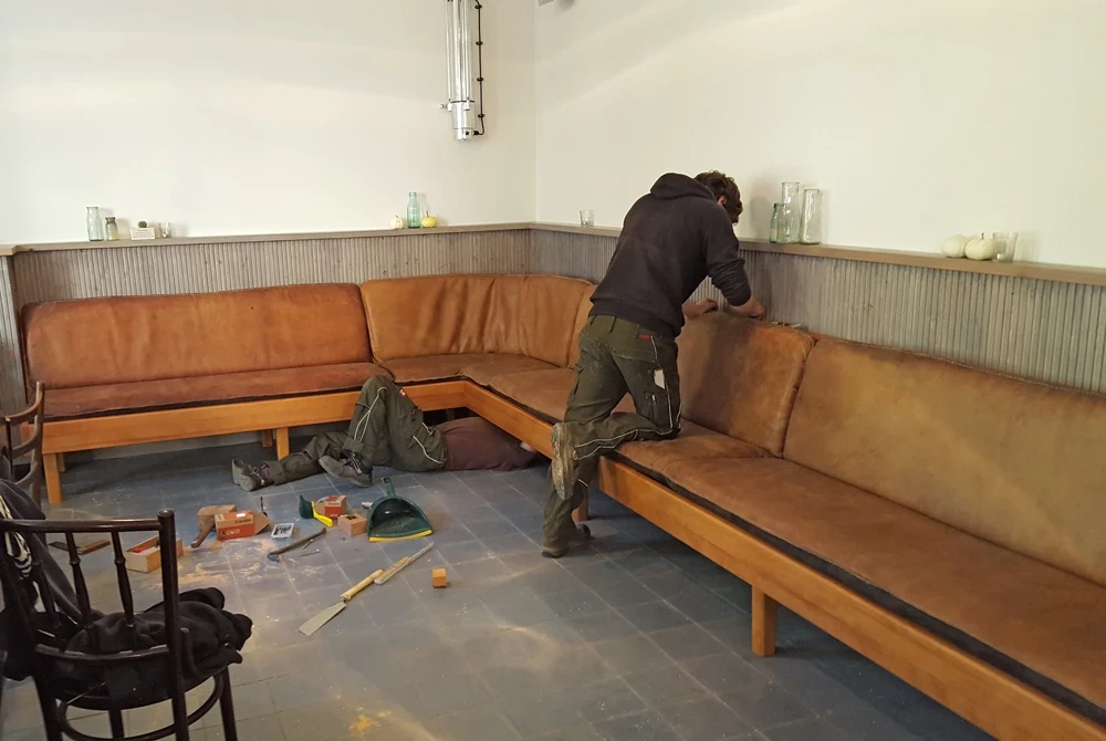 Für das Café "The Flow" wurde eine maßgeschneiderte Eckbank mit Polsterauflagen aus recycelten Lederturnmatten angefertigt. Das Untergestell aus Buche entstand in Zusammenarbeit mit Goldstein & Co.