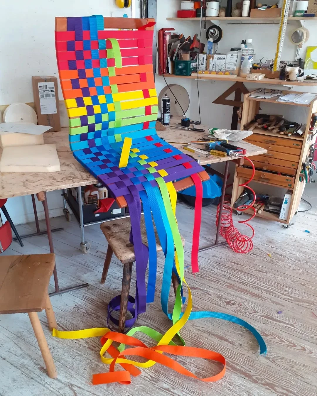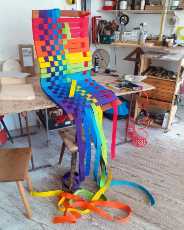 Der Regenbogen-Stuhl basiert auf einem Gestell von Kim Samson für IKEA aus den 1980er Jahren. Die Konstruktion besteht aus Birkenschichtholz und Ahorn.