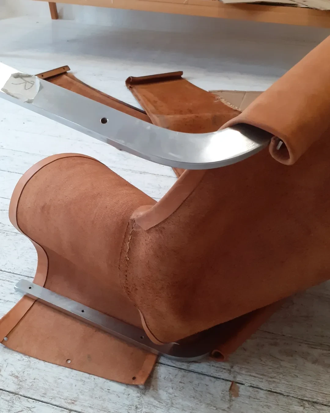 Die Montage stellte aufgrund der charakteristischen organischen Form des Sessels und der Materialeigenschaften des Hartleders eine besondere Herausforderung dar. Die Neubeledung erfolgte unter Berücksichtigung der ursprünglichen Konstruktionsweise, um die skulpturale Linienführung des Paulin-Entwurfs zu erhalten.