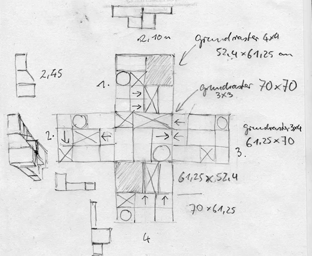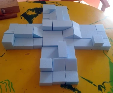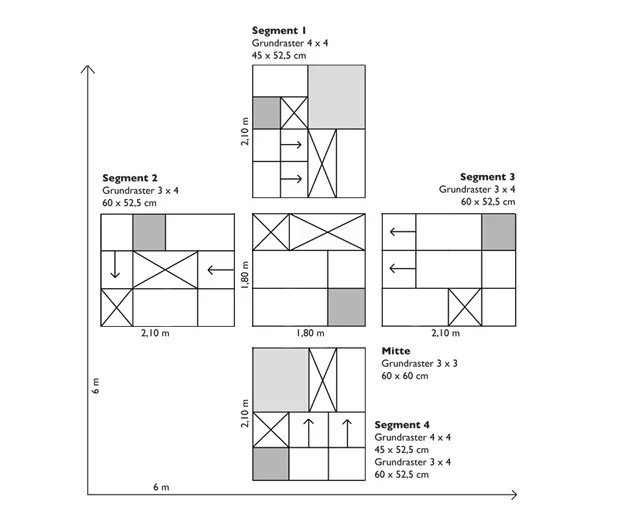 Die Polsterlandschaft nimmt die Form eines Kreuzes auf und erstreckt sich über eine Fläche von 6 x 6 Metern. Die Konstruktion ist in fünf Segmente à 2 x 2 Meter unterteilt und damit zerlegbar konzipiert. Die modulare Gestaltung kombiniert Sitz-, Sofa- und Liegebereiche mit integrierten Tischelementen.