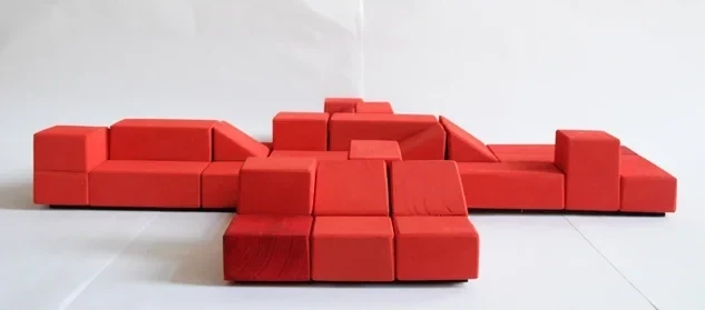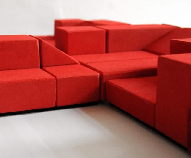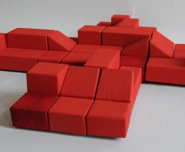 Die Sitzbausteine bestehen aus Holzkuben mit verschiedenen Schaumauflagen, die durchgehend bezogen sind. Die Tischelemente sind aus Holz gefertigt und kirschrot gebeizt.