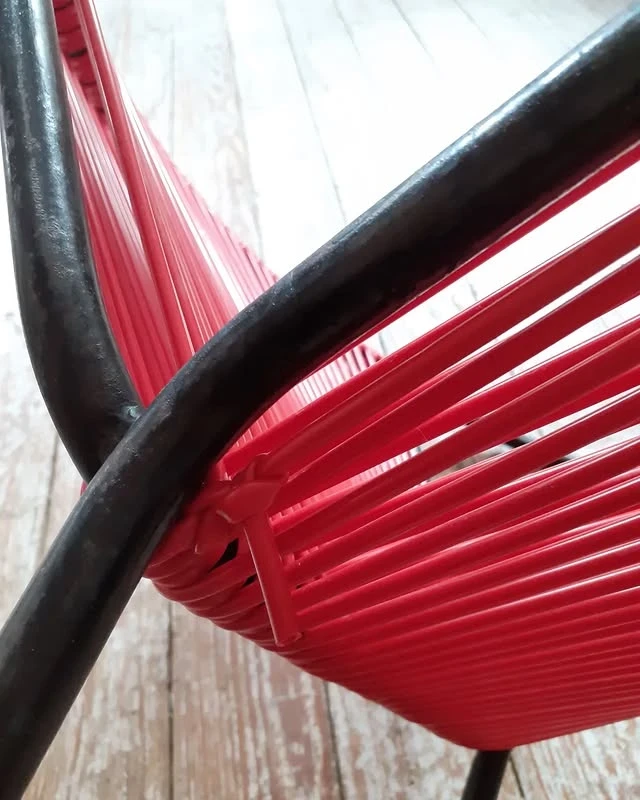 Die Spaghetti-Stühle wurden im Rahmen einer vollständigen Restaurierung bearbeitet. Der Prozess umfasste zunächst das Entfernen der alten Bespannung sowie die Entrostung des Metallgestells. Anschließend erfolgte eine Neulackierung.