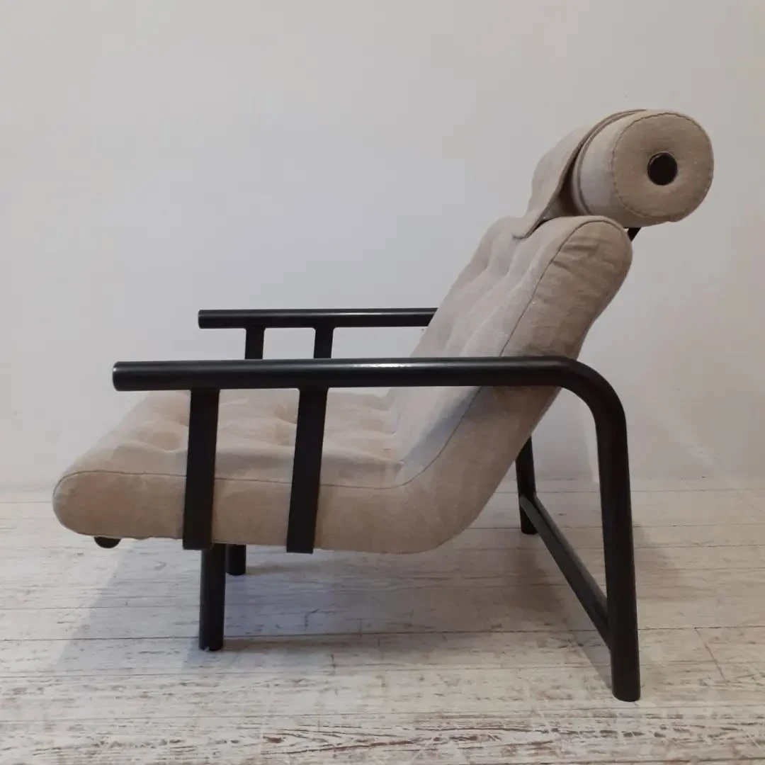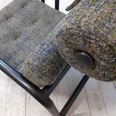 Ein besonderes Merkmal des Sessels sind die abnehmbaren und waschbaren Bezüge mit Klettverschluss. Diese können individuell mit verschiedenen Stoffen, Naturleinen oder Leder ausgeführt werden. Die hier gezeigten Ausführungen verwenden einen Bezug von Dekoma in Mittelgrau meliert und Naturleinen in Hellgrau.