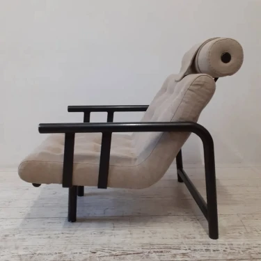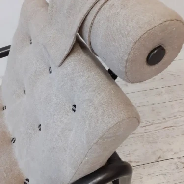 Die Konstruktion besteht aus einem pulverbeschichteten Stahlgestell mit gepolsterter Sitzfläche und Rundpolster am Kopfteil. Die Gesamtabmessungen betragen ca. 70 x 100 x 80 cm bei einer Sitzhöhe von ca. 30 cm.