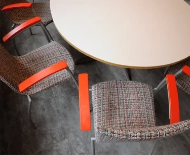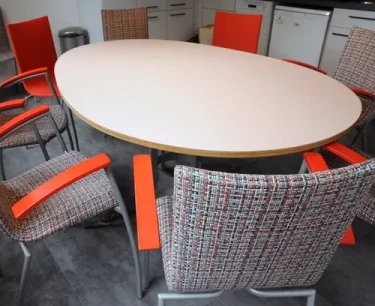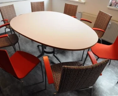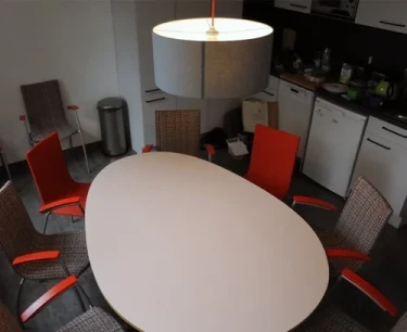 Die Raumausstattung umfasst acht individuell angefertigte Stühle, von denen sechs mit lackierten Armlehnen ausgestattet sind, sowie einen ovalen Holztisch mit Linoleumoberfläche. Die Stoffbespannung der Stühle erfolgte mit Textilien von Thevenon. Ergänzt wird die Einrichtung durch einen maßgefertigten Lampenschirm mit Stoffbezug und Textilkabel.